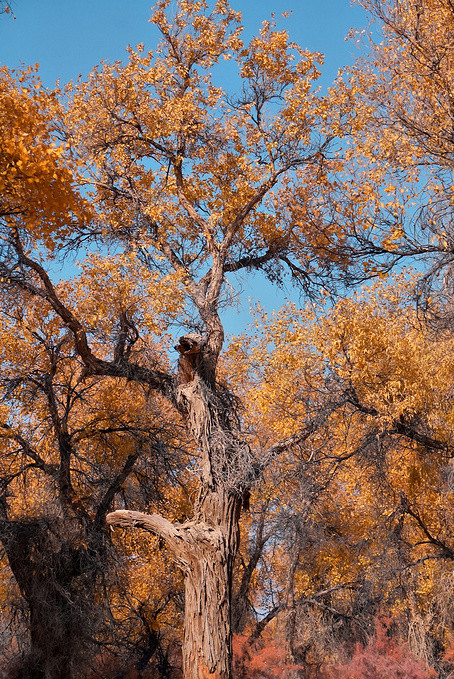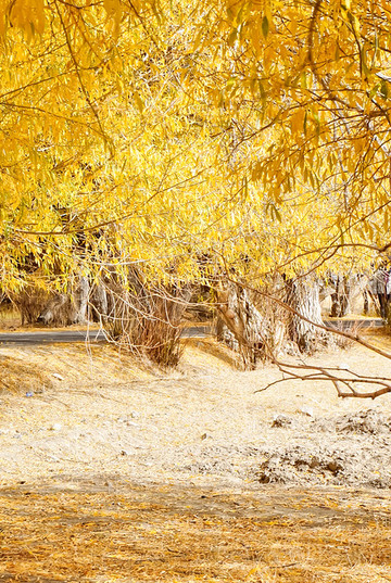 秋日的塔里木,大片的胡杨,在时光的轮回中,悄悄换了金黄。金色的阳光,金色的胡杨,金黄色的树叶在阳光的照耀下,更是层林尽染,美轮美奂,将单调的沙漠装点得像童话世界般美丽。在金黄的树影间你会惊觉:“这才是秋天啊”!