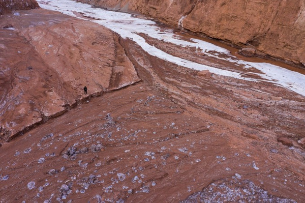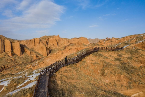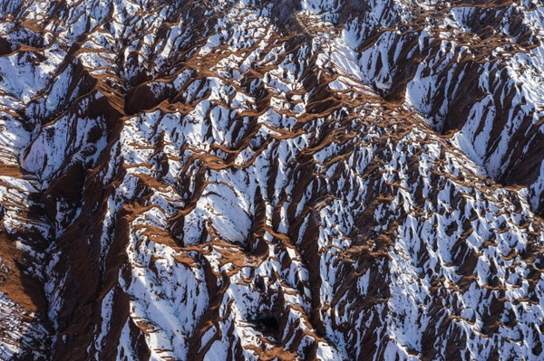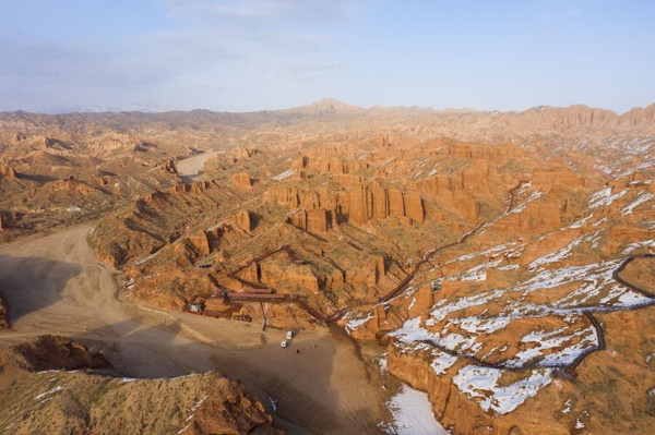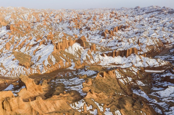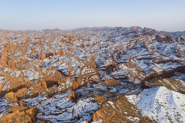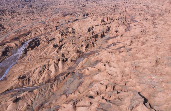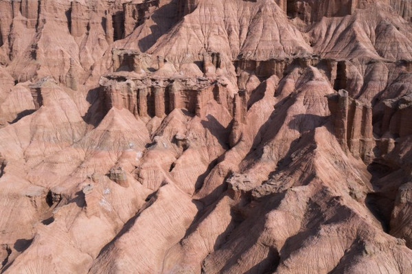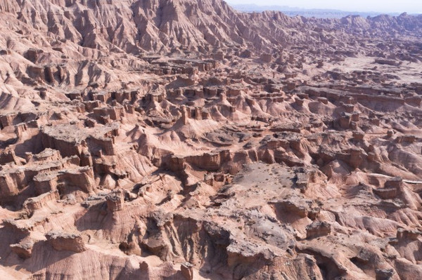 在蜿蜒曲折、大大小小的沟壑中,褐红色、黄绿色、灰绿色的土包层层叠叠,犹如荒废的古罗马城。