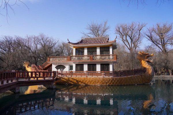 景区内有一座胡杨文化馆,外观巨大的胡杨守护神格外逼真显眼,慈祥的样子和蔼可亲,在馆内可以了解到许多关于胡杨的知识。