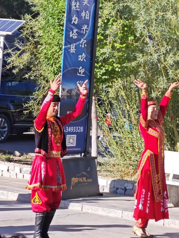 正在上演,激烈欢快的音乐伴随着青年儿郎与少女的舞步,带动着诸多旁观者尤其是游客打扮的人身躯的晃动,哈,想来,或许这些游客在其当地也是广场舞的领袖人物,来到新疆,在这样明快的音乐之下,岂不有一种鱼归入大海的舒畅感?