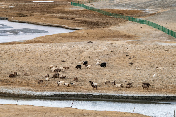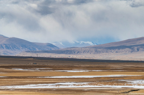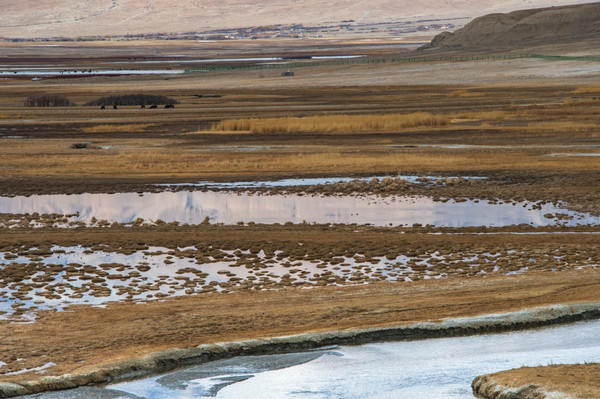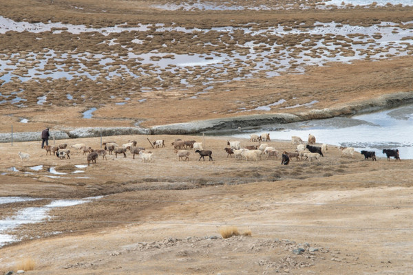 17:00沿着喀喇昆仑公路一路南行,四面环山,雪山冰雪融化形成的溪流汇聚于此,溪流蜿蜒曲折,水草丰美,在金黄的大草地上散落着稀稀拉拉的牛羊,恍若内蒙的草原风光。