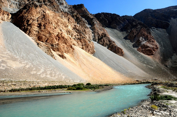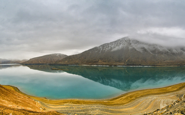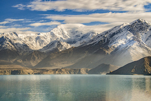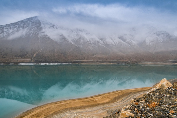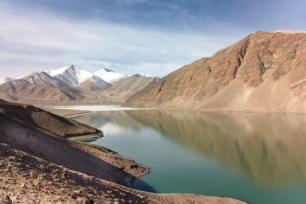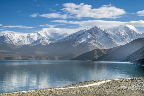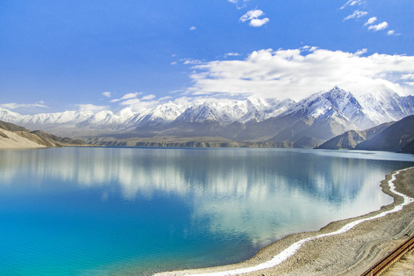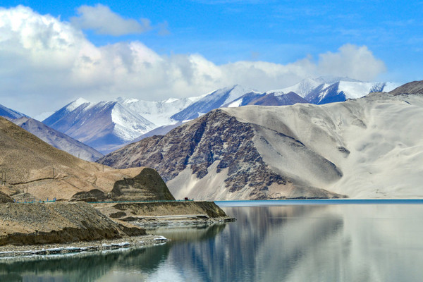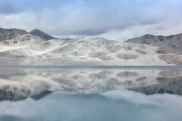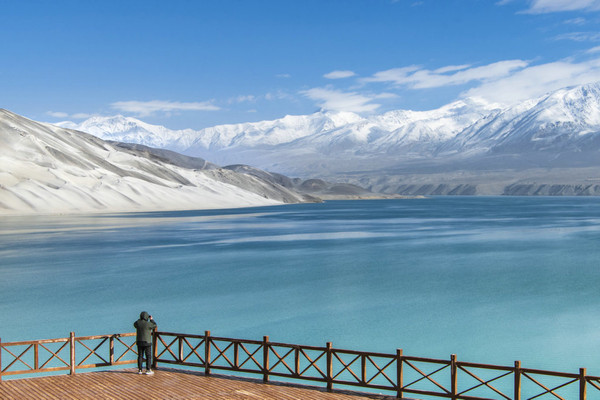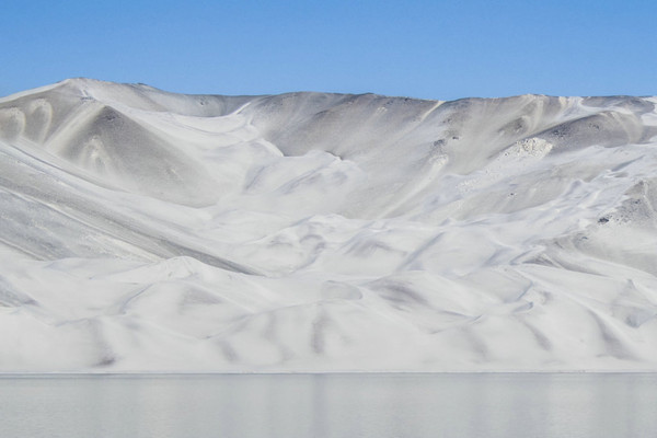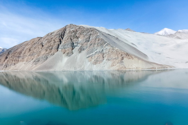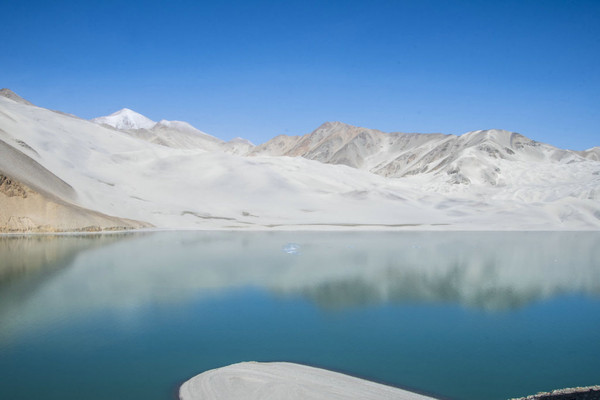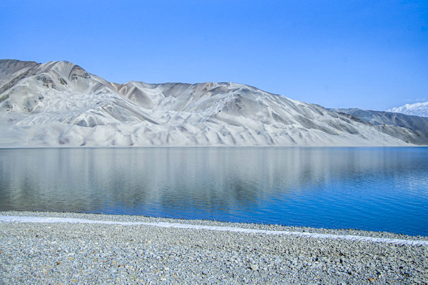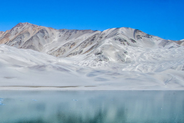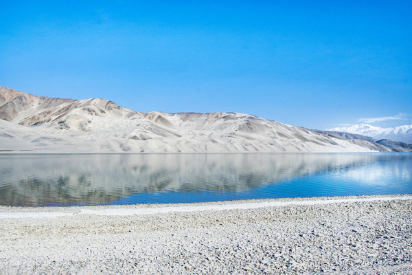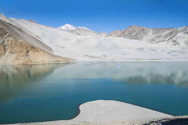 白沙山山体表面附着的白沙经过了数万年风化,在帕米尔高原洁静的阳光下,闪耀着金属般的光泽。湖水在天空、白沙和雪山的综合作用下呈现出一种别样的蓝,深邃的蓝,非常迷人。