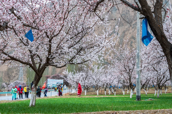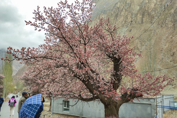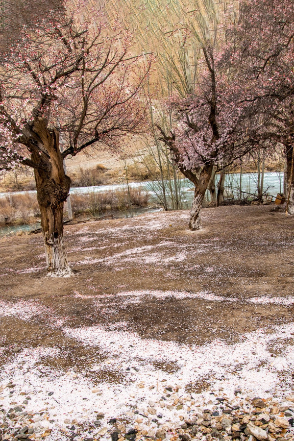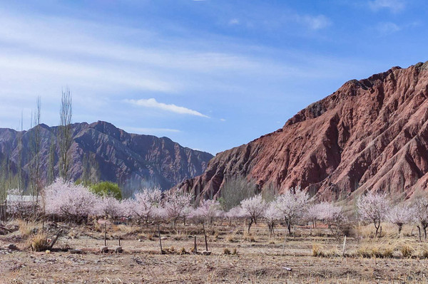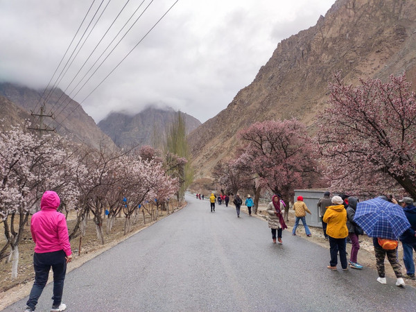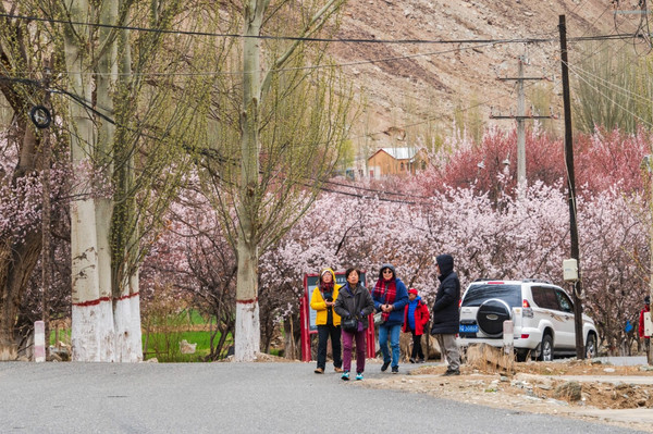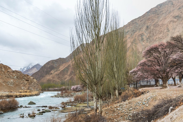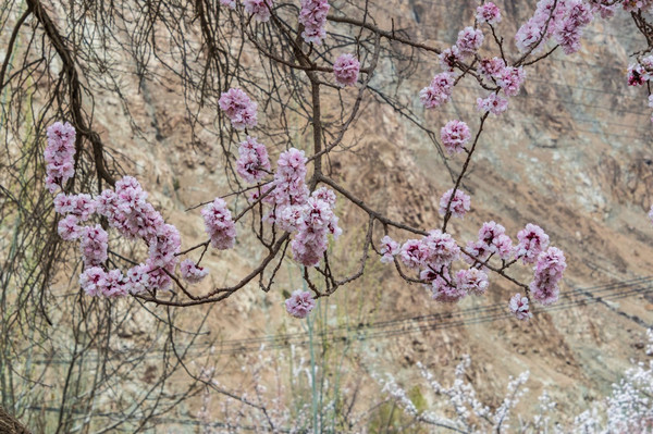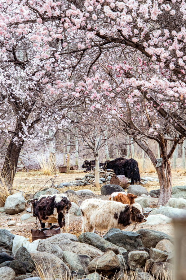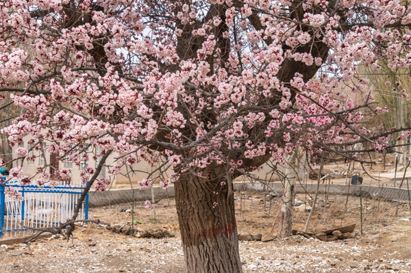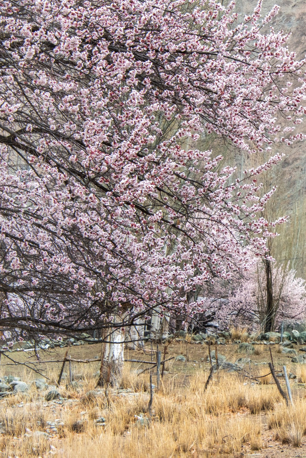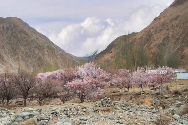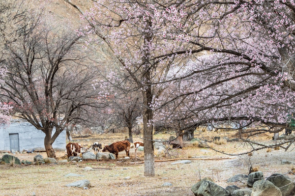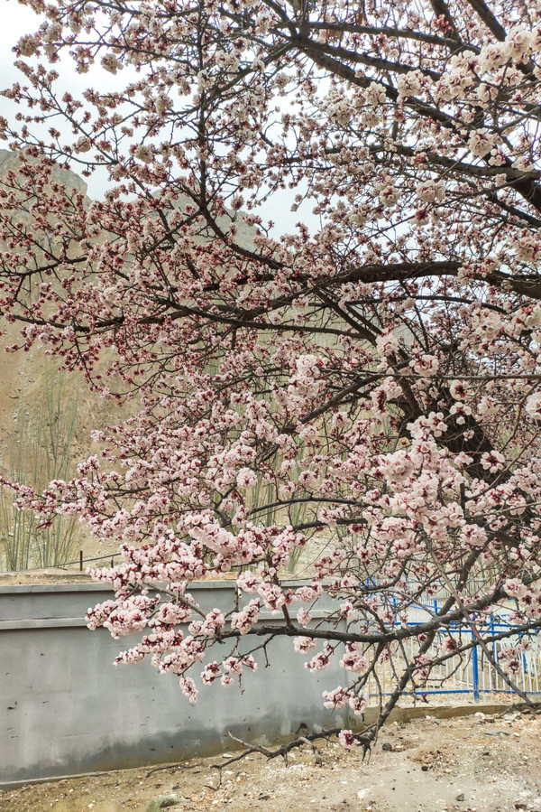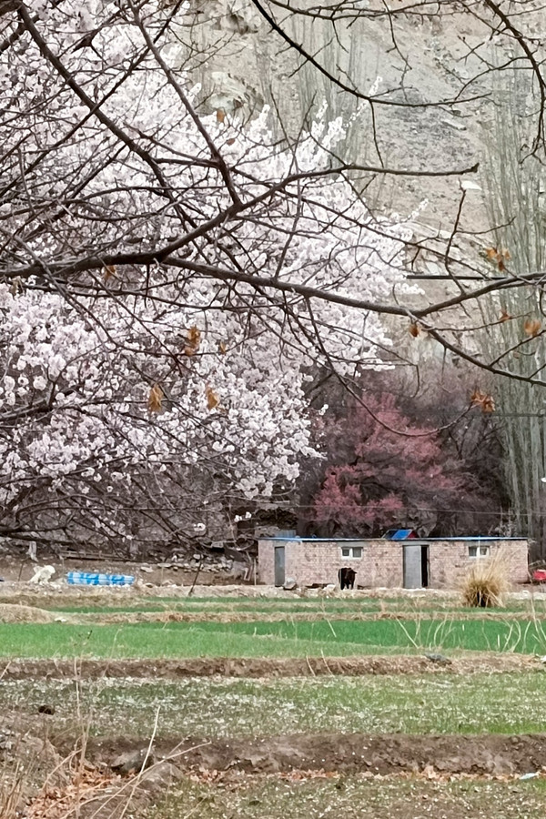 村庄一路走一路惊叹,红色、粉色、粉白,随处都像一场色彩的盛宴,冷峻的雪山和苍凉的峡谷围着那些杏花林子,强烈的视觉对比,充满野性的美,