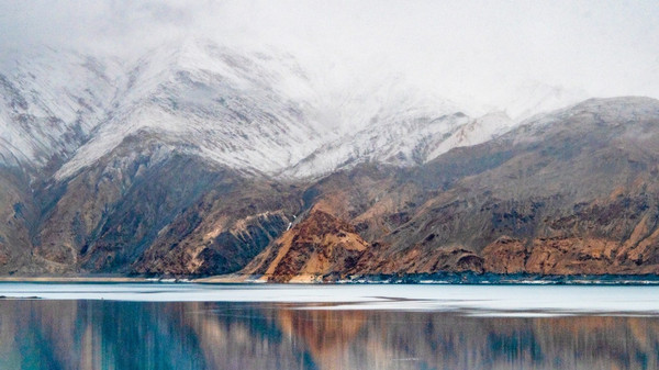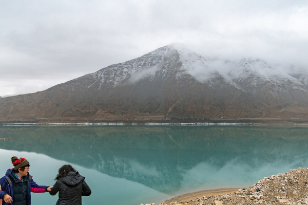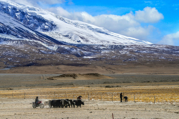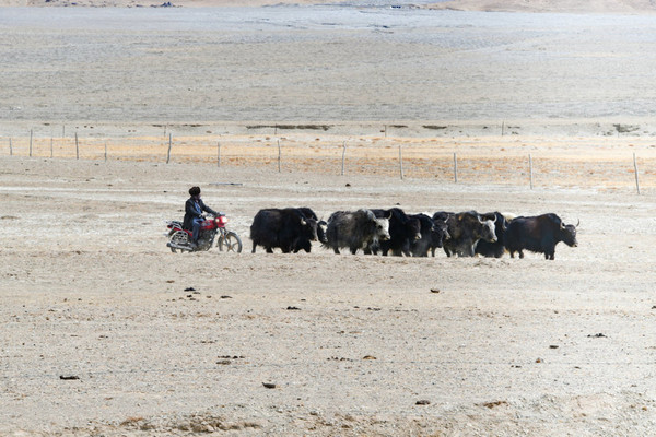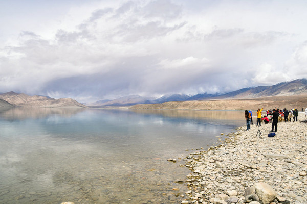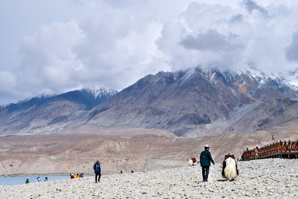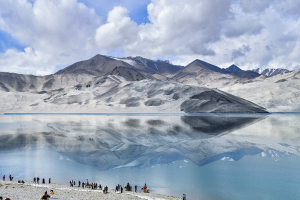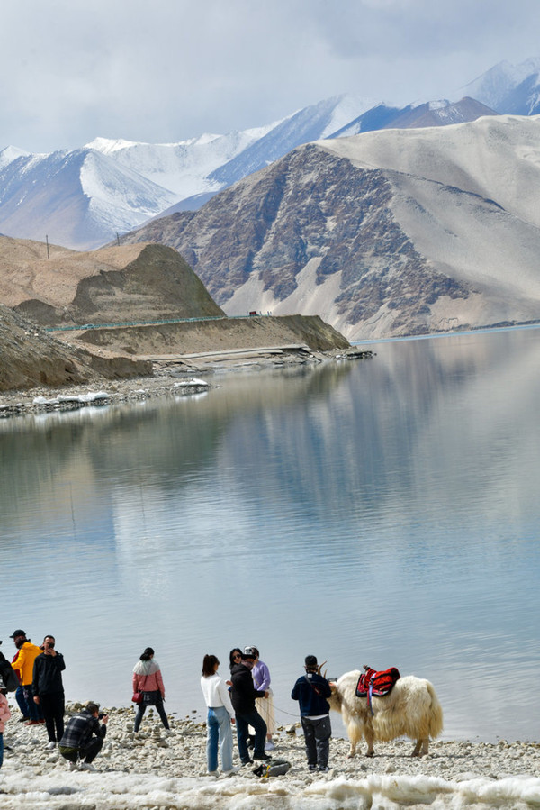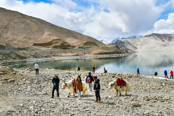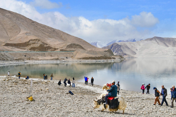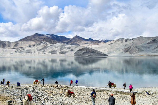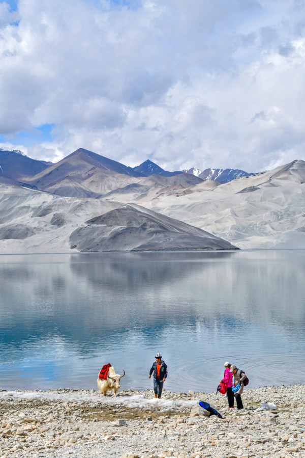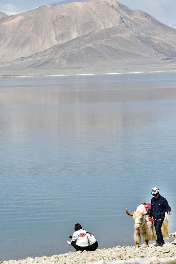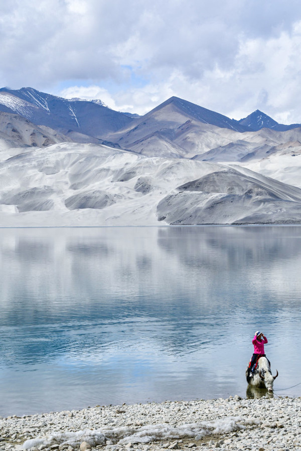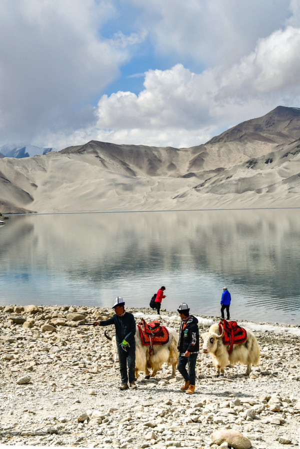 这里湖面如镜, 白沙 如雪,景观令人震撼,湖边当地牧民骑着牦牛,招揽游客拍照。