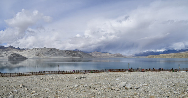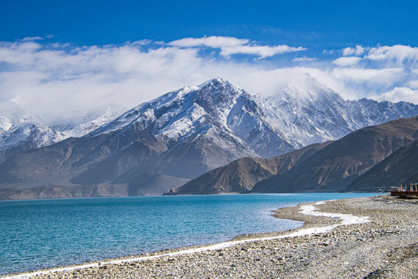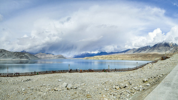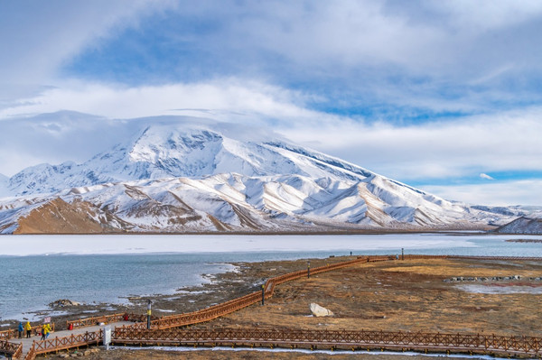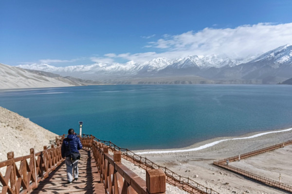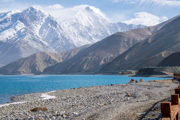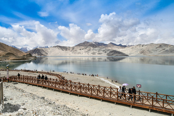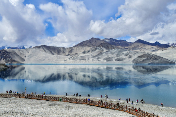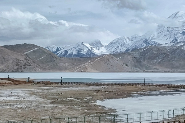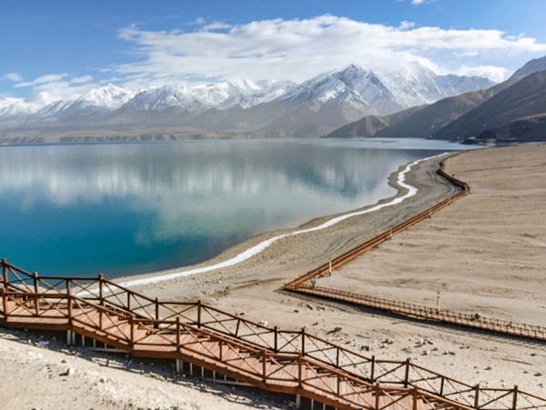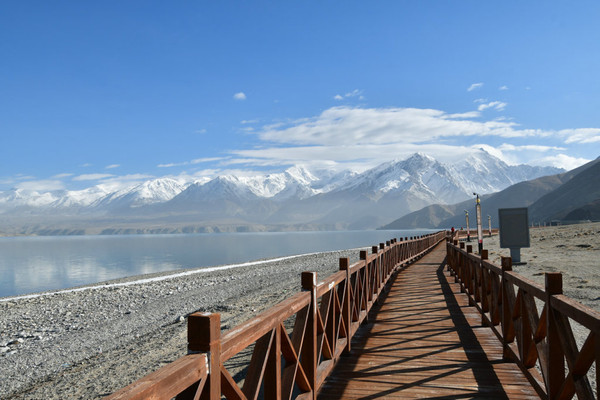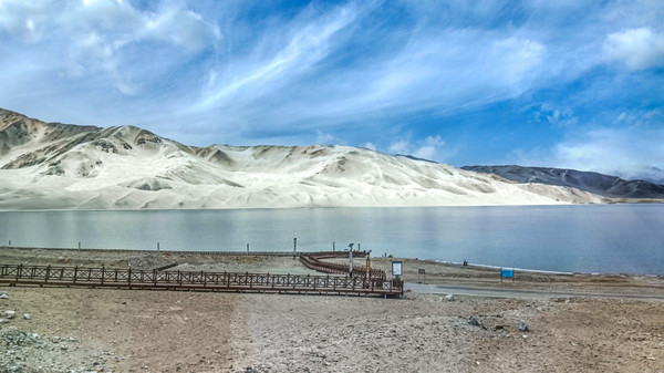进了景区我迫不及待走上栈道,我怎么也不敢相信,一片荒山雪岭中竟然有如此天境仙女似的湖泊!被眼面突然出现的湖泊所震撼:真不愧是帕米尔高原上的珍珠!