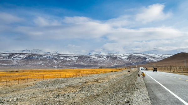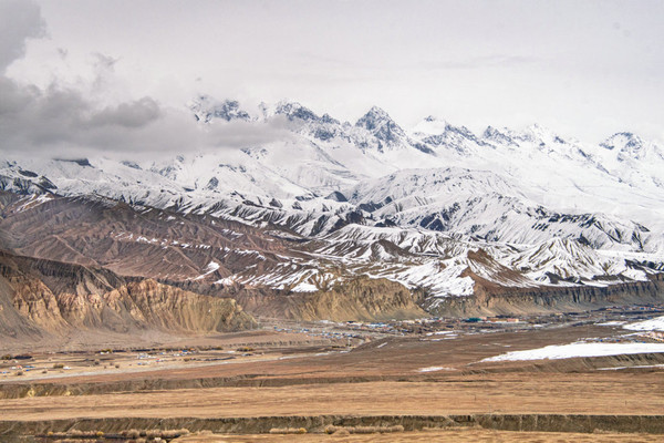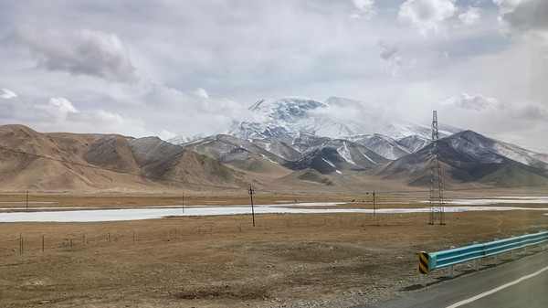 雪山依旧连绵不绝,蓝色的湖面不见了,出现了一大片土黄色的沙丘盆地,中国 面积最大的内陆盆地— 塔里木盆地西部边缘。古时这里是至葱岭、帕米尔高原的重要 通道 ,如今依然是一路雪山渺渺,山涧蜿蜒······