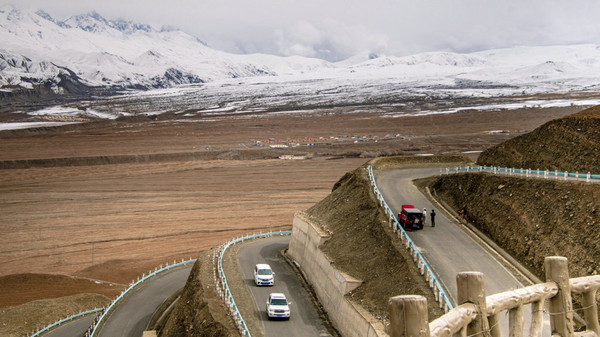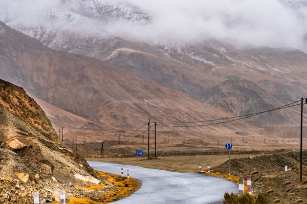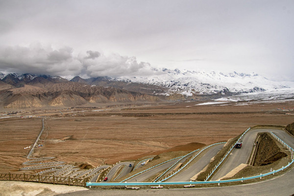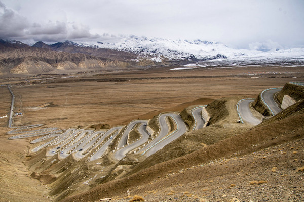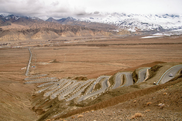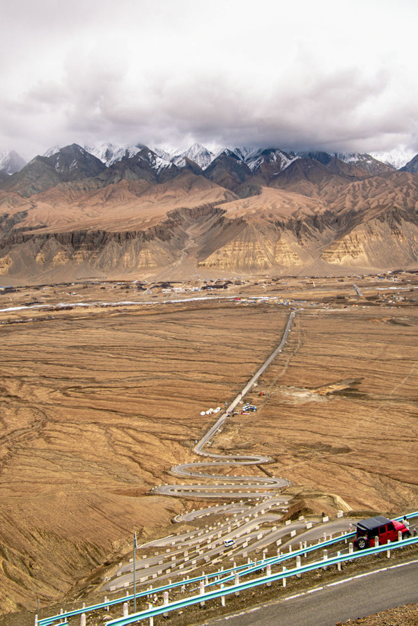 黝黑的盘龙古道蜿蜓向上,好似黑蟒出行。在远处连绵的雪山呼应下,盘旋的公路又像一条绸带,风情万种地飘逸在帕米尔高原上。
