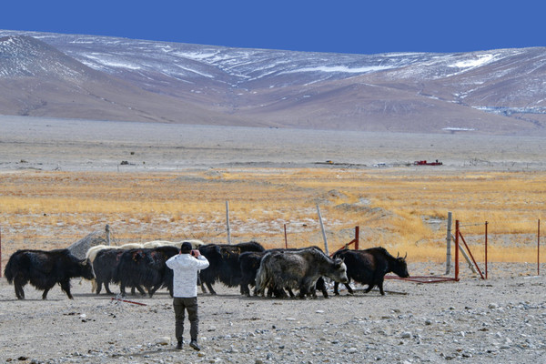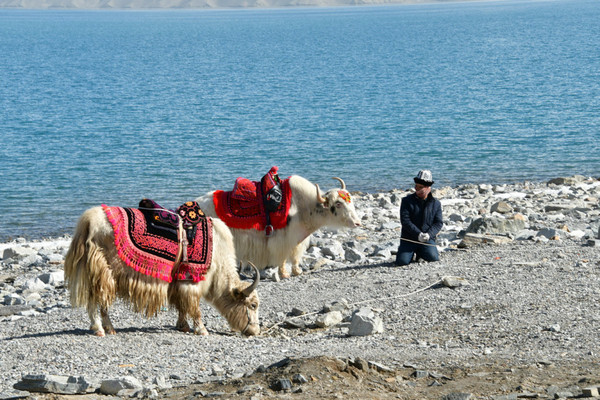 湖边当地牧民骑着牦牛,招揽游客拍照