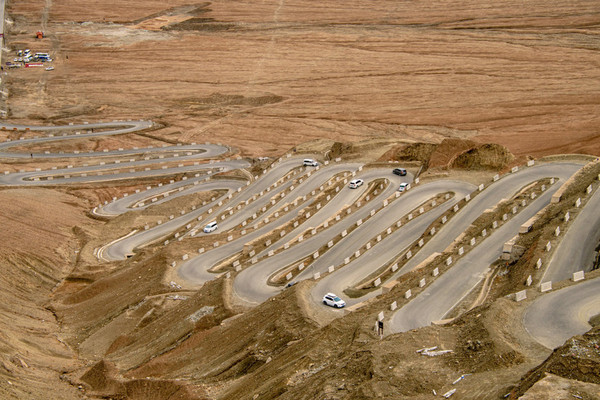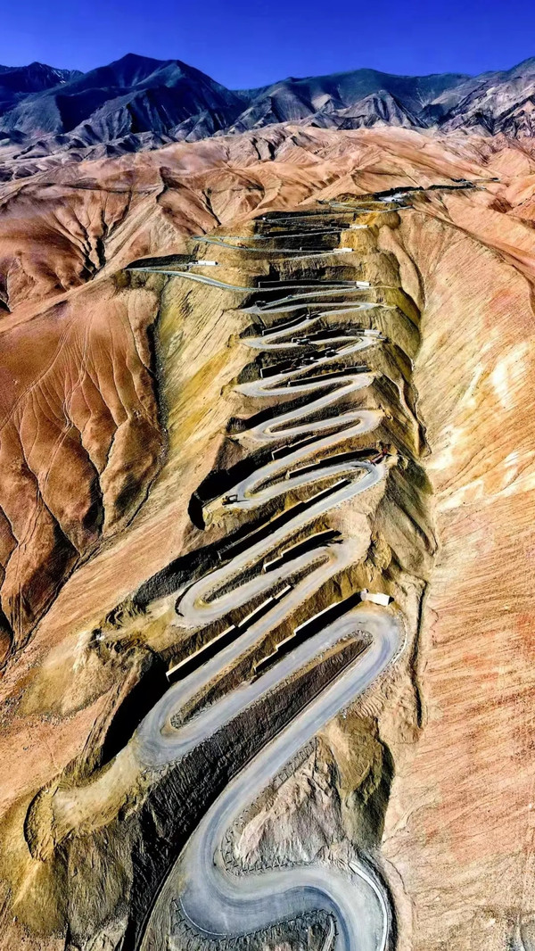 盘龙古道:这条网红公路叫瓦恰公路,因像一条巨龙盘卧在大地上,所以也被称为“盘龙古道”。全长70多公里,是一条为了方便牧民出行而修建的从塔县到瓦恰乡的公路,其中真正的盘龙古道全长30多公里,竟有600多个弯,还有不少是180度甚至270度大弯,空中俯瞰像是游戏地图一样。下图是摄友圈的图片