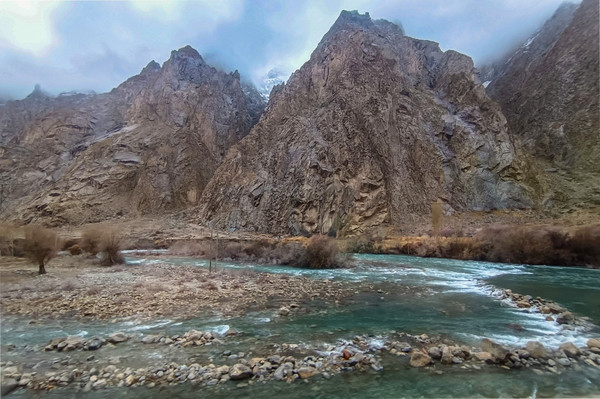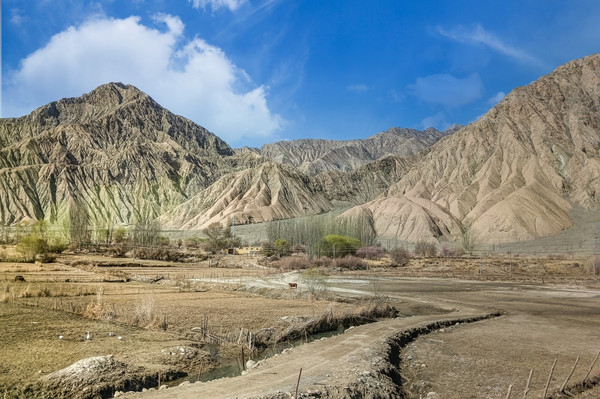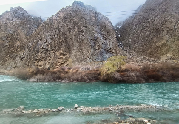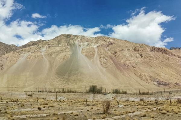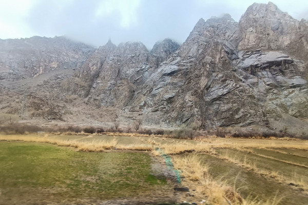 4月1日早餐后,9:00前往素有“帕米尔果乡、杏花村之美誉”的库科西鲁克乡,9:40大巴停下,导游说这里是班迪尔水库,当然不是网红景点班迪尔水库的景点,可能能沾点边,景色还是不错的,行程中没有这点,算是福利吧,还得导游和司机