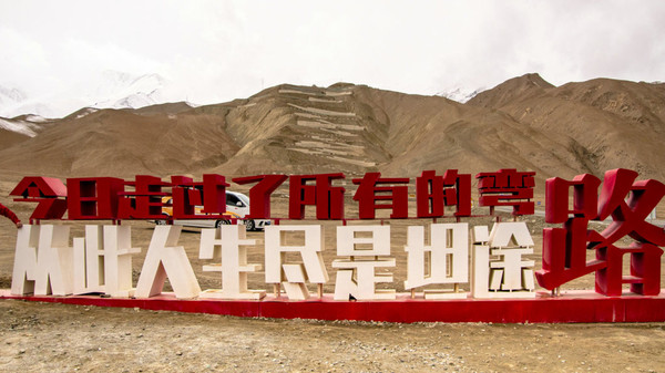 伴随盘龙古道的迅速走红,帕米尔高原又增添一句经典妙语。就连公路前方牌子上的话都富有哲理:今日走过了人生所有的弯路,从此人生尽是坦途。