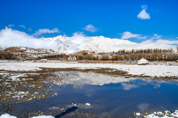 这片美景就如同帕米尔高原上的仙境一般。地上一条冰带,勾画的生气勃勃