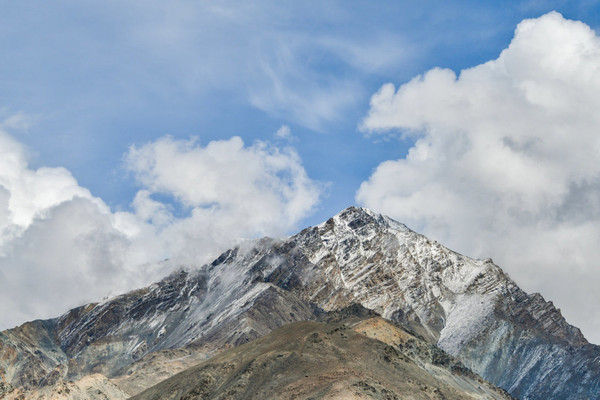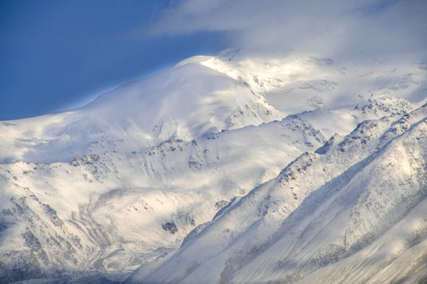 一座非常壮观、浑圆的的大雪山,带着一生的雾气