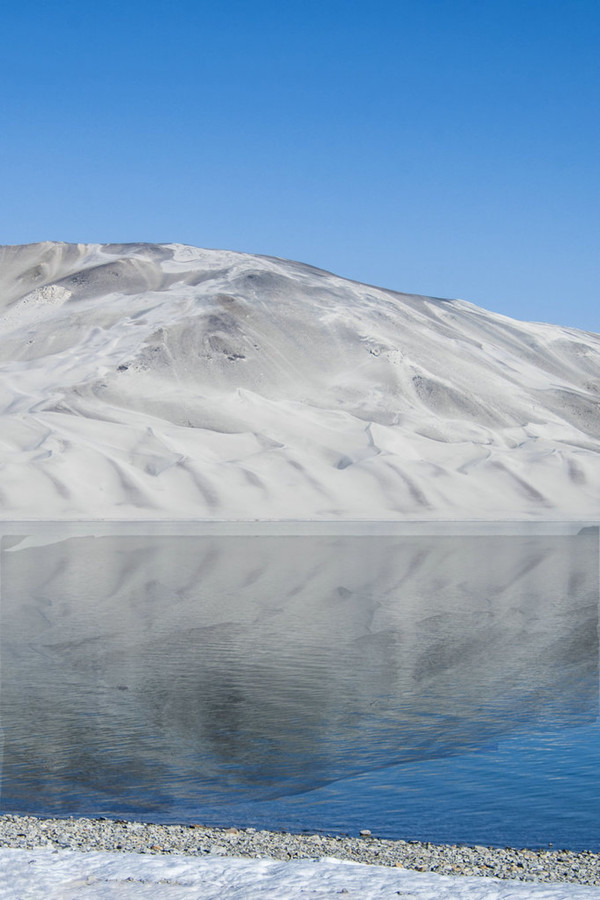 白沙湖两侧遥遥矗立着公格尔九别峰。高山是沙山,沙山是银白色的,银白色的细沙洁白柔和,犹如白绸。这样的美景,让沉睡了万年雪山和湖水显得更加素洁与寂静。