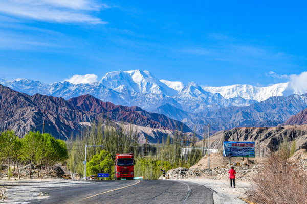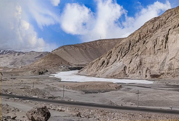这是一条连接 中国 西部与 巴基斯坦 的公路,全长1032公里,其中 中国 境内416公里, 巴基斯坦 境内616公里。英文简称为KKH,被称为“世界第八大奇迹”。 经过中巴边境口岸红其拉甫山口,南至 巴基斯坦 北部城市塔科特,然后直达 伊斯兰堡 。车行进在海拔三千多米的盖孜峡谷中。 喀喇昆仑公路象一条玉带,沿着盖孜河在盖孜峡谷中穿梭着,眼前的景色又变成了绵延不绝的荒山雪岭。