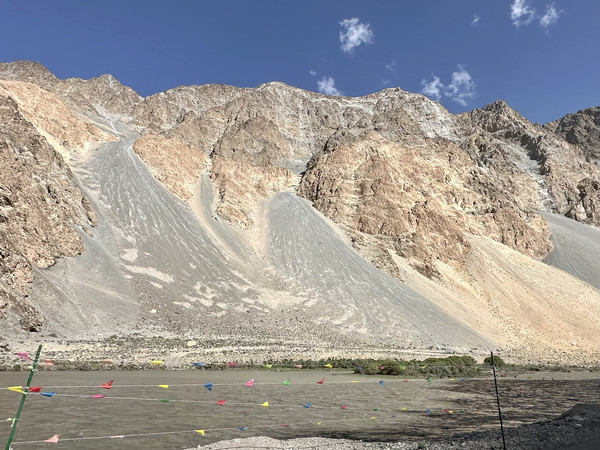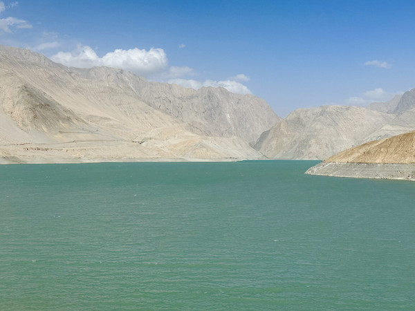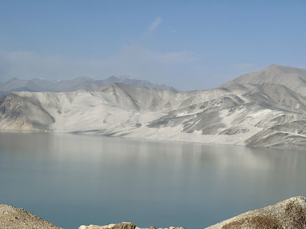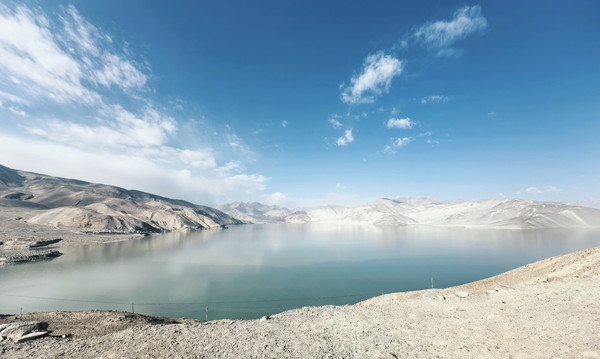 原本今天的主线任务是此行的重头戏之一——白沙山白沙湖,但是完美的天气加上绝美风景让我们开启了隐藏的支线任务。为了避开人流我们6.20起床7:00出发,此时的喀什还是凌晨,从喀什到白沙山北岸观景台,一路的车程大约是三个小时,沿途都是风景,道路很好但是车很少,一路上我们走走停停,在北京时间9:50左右到达了白沙湖景区。我们驾车到了一处绝美的观景平台,实际上离北岸观景台还有几百米的距离,但是我们已经被这片摄人心魄的景色迷得寸步难行了,一半银沙、一半湛蓝。这里能看到白沙湖的全景,关键这片区域还没人,雪山就在路的两边,近距离环绕的感觉。那就下车拍拍拍吧,旱地拔葱什么的全都安排!