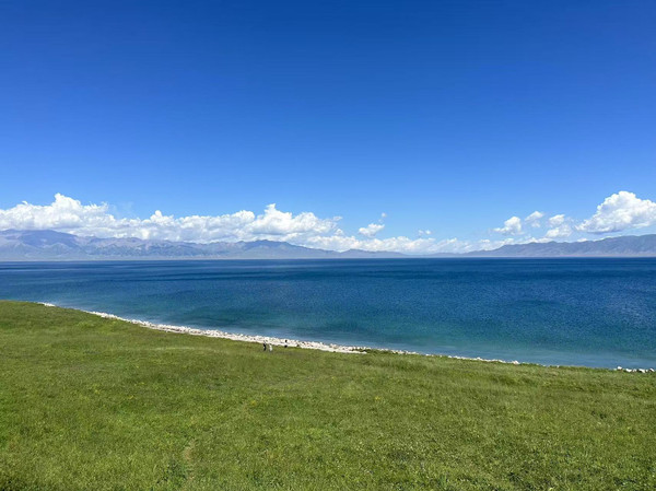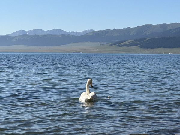 在蓝天白云加持下的赛里木湖任何词藻在她面前都黯然失色,她就像一块被天神遗落在人间的宝石,随着随着天光云影山风的不断交织,湖水的颜色也随之变幻,构成了大自然最奢侈的撞色方案。远眺时湖面如凝固的靛青绸缎,近观时湖水又澄澈得能倒映出云朵的魂魄,此一刻还犹如天空跌落人间的蓝丝绒,时光仿佛停止旋转,霎时间湖面碎成无数闪耀的鎏金碎片,就像湖底藏着一个燃烧的太阳。湖面上还会出现三两成行的天鹅,它们静默地游弋,给静谧的赛湖增添了灵动与优雅。置身于此方天地间,闭眼呼吸,你能感受到天地灵气的萦绕,荡涤旅途的疲乏,渐渐的忘记,忘记了时间……