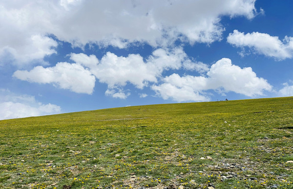 支线任务奖励2:号称有608个弯道的盘龙古道!据说只要能过此弯,今后人生都是坦途!盘龙古道大概30KM,海拔从3000M升到4200M,海拔落差超千米,原本用在慕士塔格的补给一点都不浪费!整个爬升过程还是有点艰难,需要克服环境和身体双重考验,头胀缺氧的感觉还是比较明显。原本以为这一路都是这种大地苍茫荒凉之感,当到达古道顶点(约4200M),我们被这山顶的美景生生硬控了!居然是宫崎骏动画中才有的蓝天白云和高山草甸野花,还有很多土拨鼠。其中感动简直令人热泪盈眶,生而为人,惟江上之清风,与山间之明月,耳得之而为声,目遇之而成色!