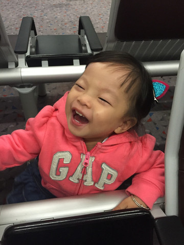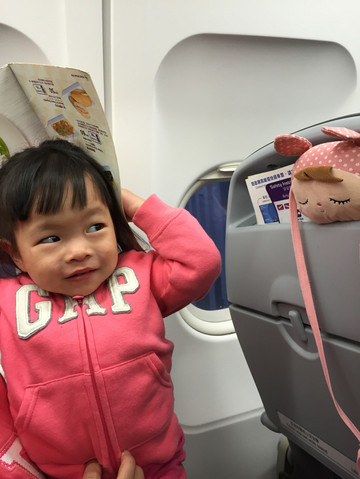07:15在香港的飞机,凌晨三点出发,包了一台香港两地牌保姆车,本次出行和好友一家6人,刚好坐下6人,但是因为3点就要出发,所以必须从皇岗口岸过关(深圳湾不是24小时通关),需要2人下来自行通关,两个爸比下车潼关。不到五点就抵达机场,并顺利办理手续。小明明哥哥推着我,抱着我,好受宠的感觉哦!香港机场很贴心,除了有康贝的推车,还有专门的儿童游乐区,就在登机口旁。