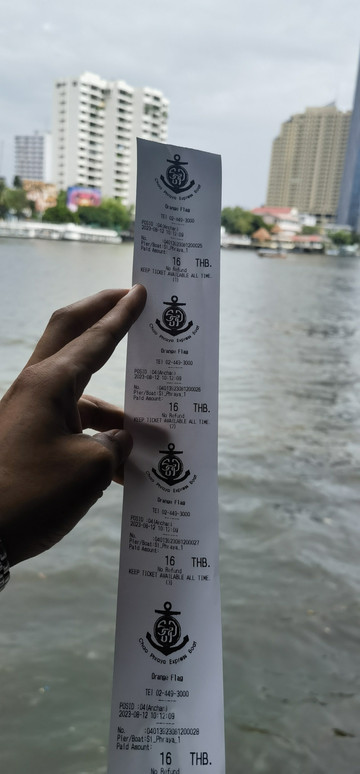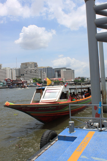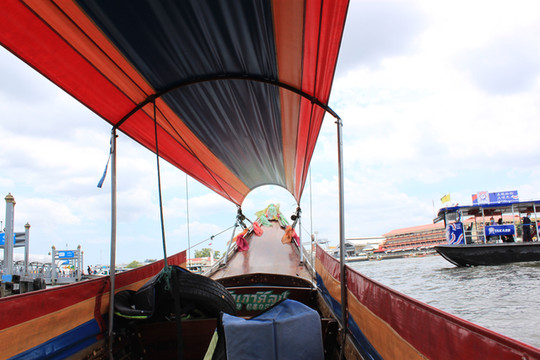 大王宫步行几百米到Tha Chang码头,有当地人来问我是否要坐船,因为没有在地图上查到路线和价格,所以我计划先探一下,就问他到郑王侨附近的码头多少钱,结果他说是游船在湄公河上看景点的,大约1个小时每人1200泰铢,我说不是,我是回酒店,结果被另一个人听到了,就说跟他去,一个人300泰铢,送到酒店附近码头。这个时候有点感觉上当了(第二天才知道真是上了当,水上交通非常便宜,算是吃一堑长一智,之后的出行水上交通占了比较多的部分),但是一想在泰国没坐过船,试一试吧,也不贵,就一路跟着这个人,穿过排队的人群,直接到了码头边上,立刻就来了漆成五颜六色的长尾船,我们四个人上去后,就直接开了,浪遏飞舟,哈哈,浪花四射,很好玩儿。早上坐BTS轨道交通用了1个多小时的路程,船用了20分钟就到了,感觉船真是方便。