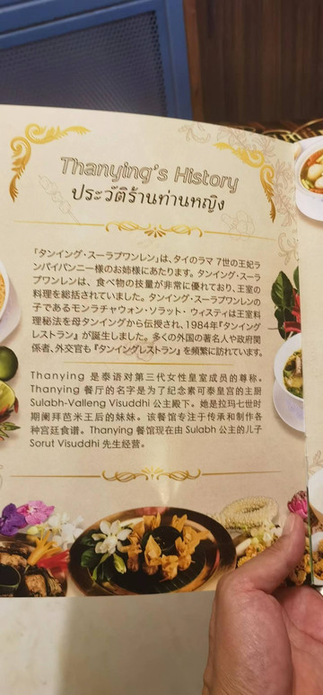 后来看餐厅介绍才知道这个Tanging餐厅是为了纪念素可泰皇宫的主厨公主殿下而取名的,现在由Sulabh公主的儿子在经营,泰国国王和王后也来这里吃饭,一不留神就皇族了一把,感觉还是很不错,菜品和服务算是一流,不虚此行。