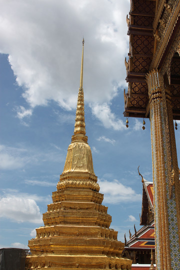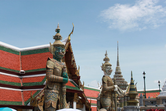 坐地铁到大王宫,到了才发现明天是太皇后的生日,明天会闭馆一天,还好选了今天去。在门口遇到一位自荐的当地华侨导游,800泰铢谈成600,给我们解说。门票500泰铢/人,大王宫一直是泰国王室居住的地方,建筑非常的雄伟,现在据说王室已经搬走,变成了纯粹的旅游景点了,门票收入全部归国王所有,想想也对,自己家的房子拿出来让人参观,门票当然应该是自己的嘛!和玉佛寺是连在一起的,是泰国王室御用寺庙,大殿里有一尊高66厘米的玉佛,整块玉石雕刻而成,隔得太远,看不清楚,反正知道这个佛肯定很值钱。