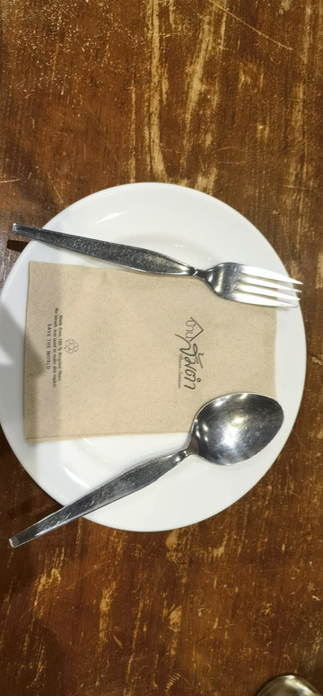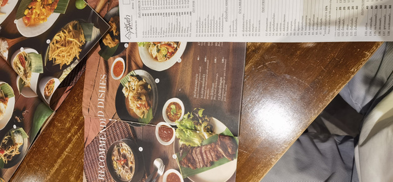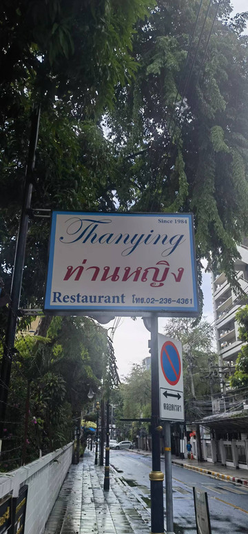 谷歌地图上寻找吃饭的地方,看见离站台不远的小巷子里有一个餐厅叫Thanging,餐厅的评价还可以4.8分,是泰餐,走路也就几分钟,在雨停了的间隙,赶紧过去。餐厅门口有一个停车场,入口处是一个花廊,餐厅门也就普通的90厘米的玻璃门,进去后布置像是高档餐厅,木质的桌椅,精美的桌布。有服务员带领我们坐下,餐厅不大,有两个大厅的区域,每个应该有5、6桌的样子。