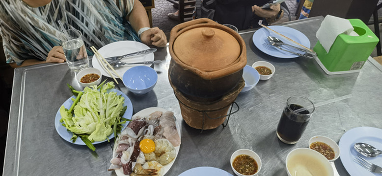 我在烫海鲜的时候也是遵循这个“定理”。在我们桌边,70多岁的老板娘实在看不过去了,直接冲了过来给我比划,她虽然是华侨,但是不会说中文,比划的意思是把海鲜先倒进砂锅,再把盖子盖上煮上一段时间才能熟,能吃的时候她会叫我。热情的指导我们,让我们尝到了海鲜正好合适的熟度和鲜美的滋味,成功的避免了第二天的“打标枪比赛”,非常感谢。