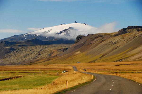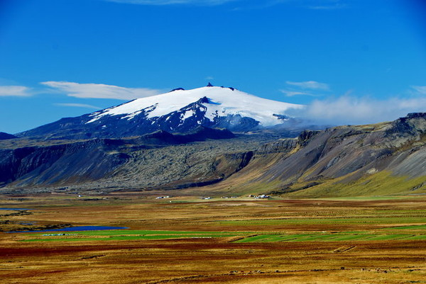 斯奈菲尔火山Snæfellsjökull,是冰岛西部的一座复式火山,头顶华丽的冰冠,是这个地区的至高峰。在天气晴朗的日子里经常可以从雷克雅未克看见它。法国 科幻作家儒勒·凡尔纳的《地心游记》一书中,将斯奈菲尔火山描述为通往地心的入口。现已开辟为国家公园。