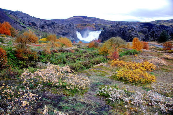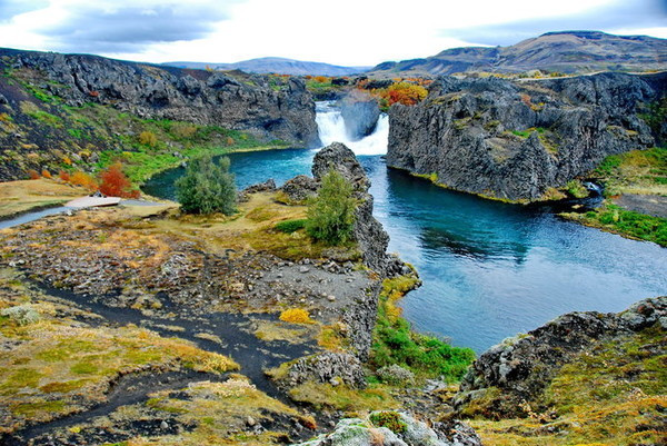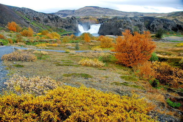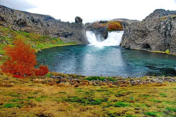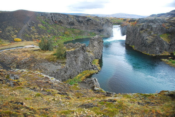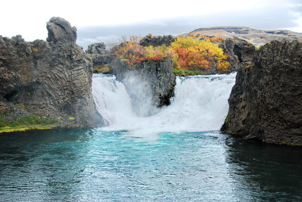 著名的哈加帕瀑布(hjalparfoss),又称双瀑布, 在冰岛南部,在去兰德曼纳劳卡的路上,非常方便。有火山岩、青苔和绿色草甸。是由两条河流的瀑流交叉而成。