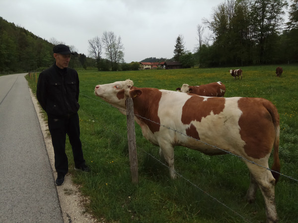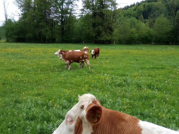 小镇牧场.寂寞的大花牛看到陌生人,全都围拢过来,表示友好.曾经看过一篇游记描写欧洲牧场无忧无虑的大花牛吃草的画面.