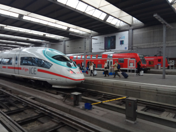 德铁快车.无安检,无侯车,无验票.站台直接上车.列车员中途查票.整个列车7~8个车箱,就一个列车员.2等车箱,双人座,只要没有预定显示的可以随便坐,预定座的很少,德国大部分人都不订座.订座要加钱的.我们没订座,也没看见满载车箱.