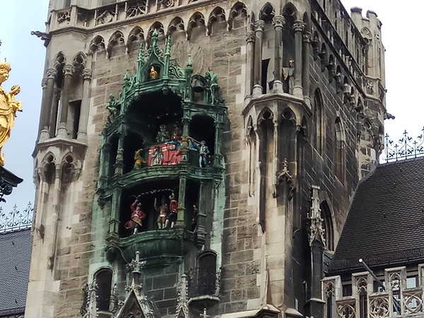 每天11、12、就会有真人大小的32个木偶演出历史剧,内容是1558年威廉5世的婚礼情景.此时塔阁里许多彩色人像分上下两层,排着队簇拥而出,配合音乐节奏载歌载舞,惟妙惟肖地再现了当年大婚庆典的场景,持续10分钟.
