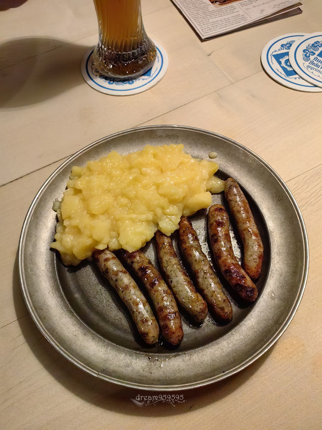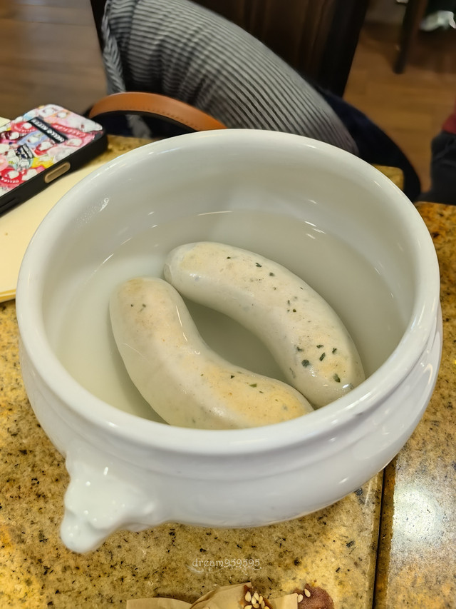 机场的餐厅里吃到了白肠,据说是小牛肉肠,但口感像鱼丸,有香料味,要剥皮吃,口味属于清淡型的。