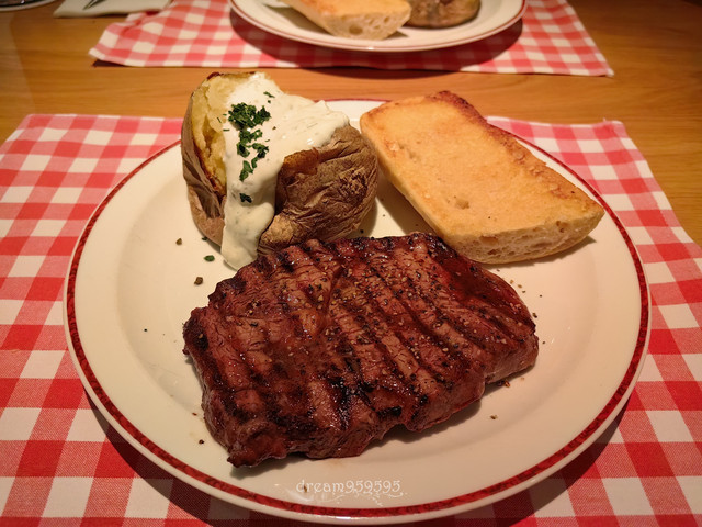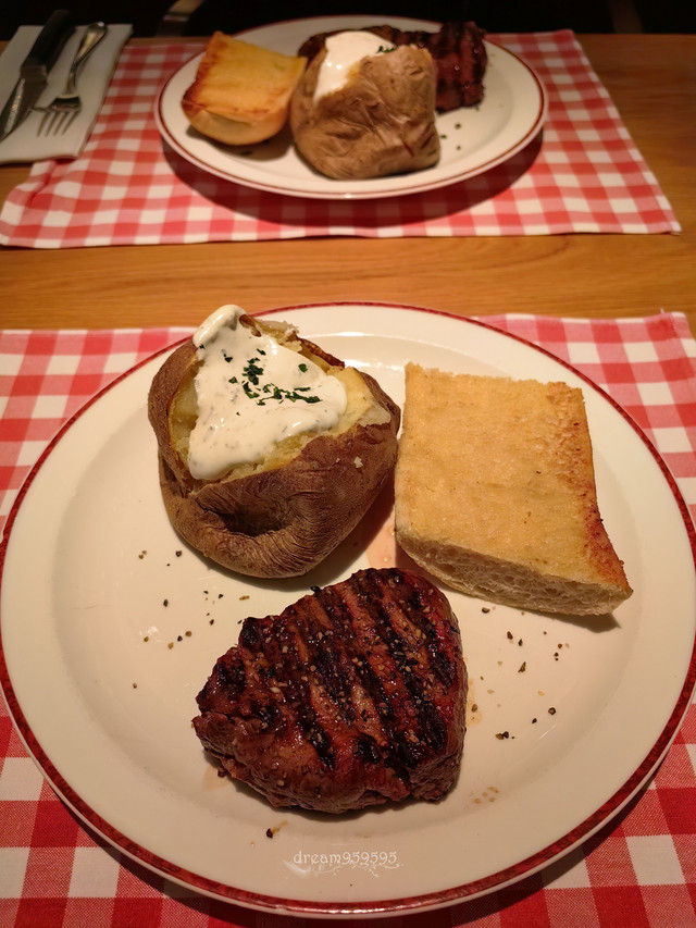 起源于德国的连锁美式牛排餐厅,网评老好了,点了肉眼和菲力,配蒜香面包、烤土豆酸奶酱、蔬菜色拉。味道其实很一般,牛肉甚至有点老。