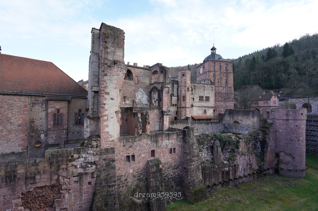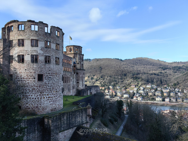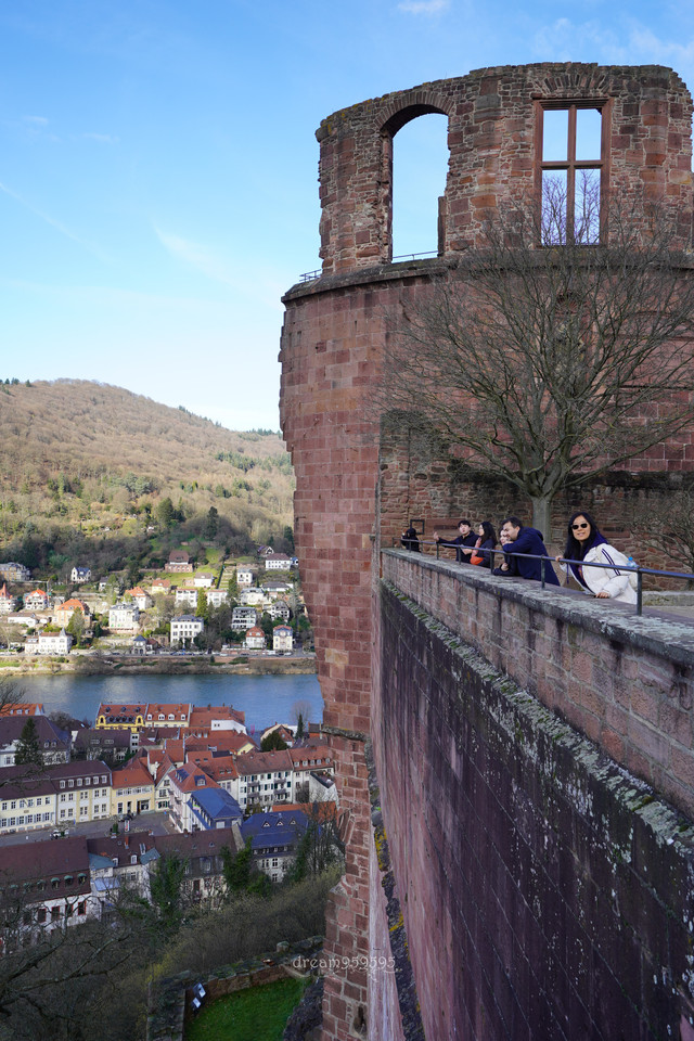 城堡在山上,爬上去十分钟,有两条路,选了阶梯的。城堡外面可以观海德堡全景。