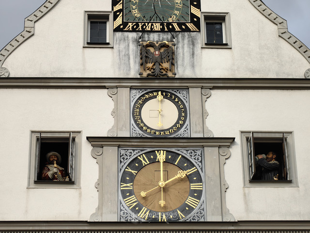 一路打卡步云莱、罗滕堡市政厅、城堡花园、罗滕堡城墙、圣诞装饰品商店,市政厅大钟两侧小窗户里每逢11点-15点整点窗户就会打开,上演市长饮酒拯救罗腾堡的木偶钟表演。