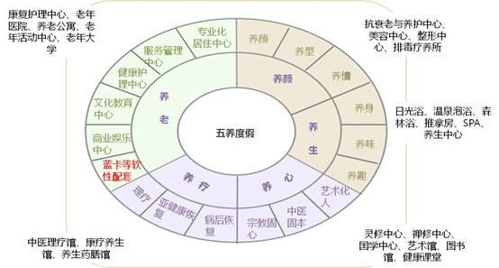 养生度假 通过旅游度假活动提高生活品质,形成健康生活方式;养心度假 通过特定的度假活动,卫护心理健康,提高精神层次;养老度假 通过生态环境好、服务完善的旅游区进行度假式、旅居式养老;养颜度假 是通过度假产品,提高旅游者外在颜值与内在气质;养疗度假 则通过疗养度假产品,帮助病后恢复人群与亚健康人群尽快恢复健康。