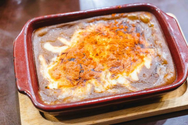 混合了东洋和西洋文化的烤咖喱,是在门司港发源的当地美食。在米饭上浇上用香料精心制作的咖喱、起司、玉米粒,放入烤箱中烹制而成。烤得恰到好处的咖喱混合着拉丝起司和半熟的鸡蛋,使美味更上一层。