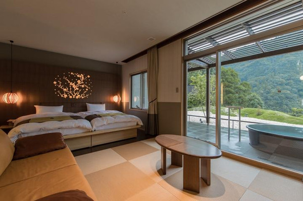若早晨入浴,可以看见被晨雾笼罩的响溪谷,如同一幅优美朦胧的水墨画。“七折、织姬、南高、莺宿、竜峡”,旅馆里每处设施的名称都是一种梅花的品种,淡雅优美。内部是空间宽敞的和室房间,摆设了用当地日田所杉制作的家具及和纸,是充满了现代感的日式疗愈空间。