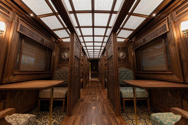 一号车厢以开放空间为主设计,以欧式华丽为主轴,就像游走在欧洲老电影中;二号车厢走的是日式和风路线,以原木间隔出一间间两人为主的包厢,带来低调质朴的感受,又有独立的空间设计。登上这辆梦幻列车,让味蕾跟着视觉一起旅行,奢华又不失典雅。