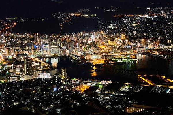 长崎港三面环山,宛如一个圆形剧场。海拔333米的稻佐山,是日本三大夜景圣地之一,山顶有360°圆筒形全玻璃眺望台,可观赏到长崎市内所有灯光群落和标志物,将整个长崎港夜色一览无余,不论在哪个角度,都有绝美风景相随。在稻佐山上还有开放式的空中缆车,俯瞰长崎街景。疏密错落的光源铺满群山,像繁星般闪烁梦幻,海面倒映着城市的灯光。