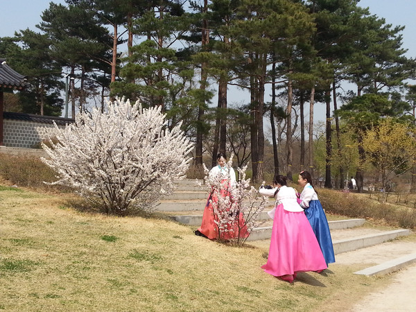一个人旅行的缺憾就是没人拍照,尤其是我那么臭美的人(我的理论是趁着现在还能看,多拍些照片存档。只能不停卖萌请路人帮忙,考虑要不要入一个自拍杆呢?虽然首尔街头全是拿着自拍杆的人,还是觉得那玩意儿挺奇怪的。正是四月晴日,草长莺飞,景福宫里春花妖娆。我拿着一张景福宫地图,强迫症又犯了,非要地图上每个标识都走一遍,听完audio guide 里面的解说才算完整。想起当年一个人暴走新加坡也是如此,看来做审计的职业病不轻。如此强迫症的好处是,对于景福宫的了解达到韩国人民的平均水平了吧。