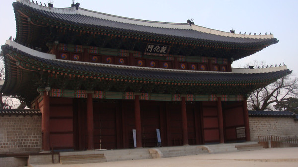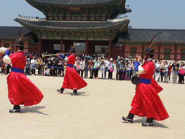暴走首尔的一天从景福宫开始。景福宫,素有韩国故宫之称,坐落于繁华都市的一角。从乐天酒店信步而去,大概15分钟就到了。春天暖阳,樱花正好,很适合游荡。景福宫得名于《诗经》,"君子万年,介尔景福" ,因为位于首尔北部也叫“北阙“ 。景福宫内,到处可见中文名字,可见中国文化对于韩国的深远影响,这是无论韩国人愿意也好不愿意也好,都无法抹杀的。感叹一下,韩国同学对于民族文化还是保护的很好的。景福宫门口站着身穿韩服的士兵,也有士兵交换仪式,估计是学白金汉宫的,规模不大,却也一板一眼,再现古风。景福宫里不少穿着韩服的少女穿梭其间,有些穿越感。