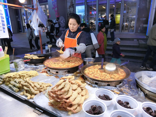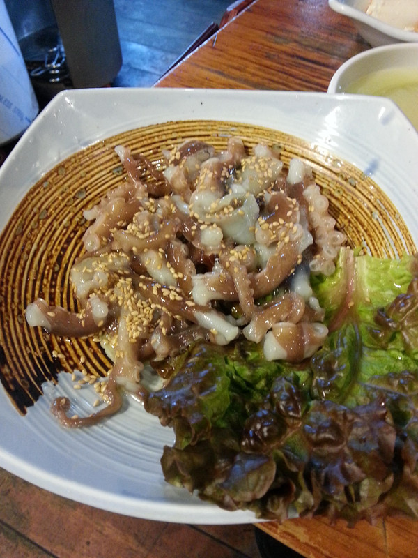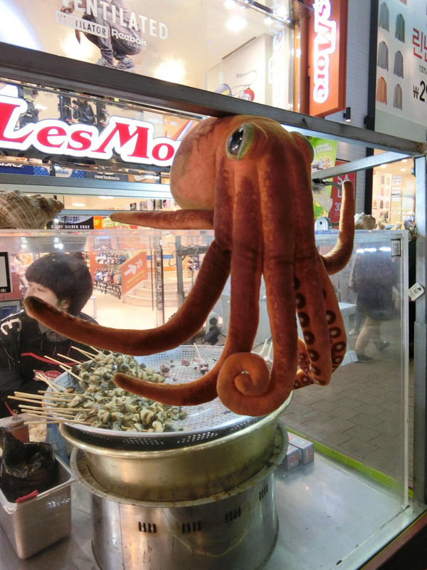 晚上回到明洞。夜晚的明洞别有一番热闹。好多小吃摊都摆出来了,还有些卖衣服饰品的小摊,有点当年七浦路的景象。看到同事发来活章鱼的小视频,一时兴起,也想尝试,在明洞随便找了一家叫火妍炉的店。活章鱼虽然尝起来味道和sashimi 差不多,但是看到筷子夹起来还在蠕动的,心里还是毛毛的。鼓起勇气吃了几个,就有点恶心不想吃了。