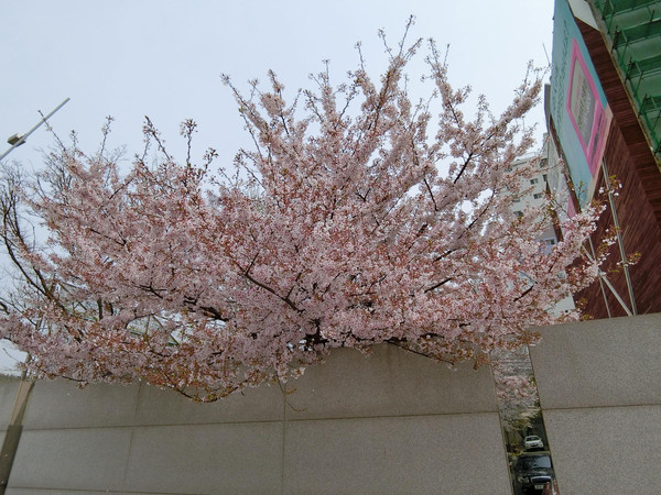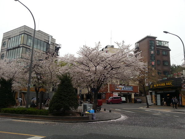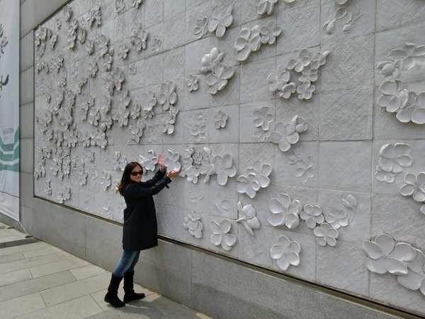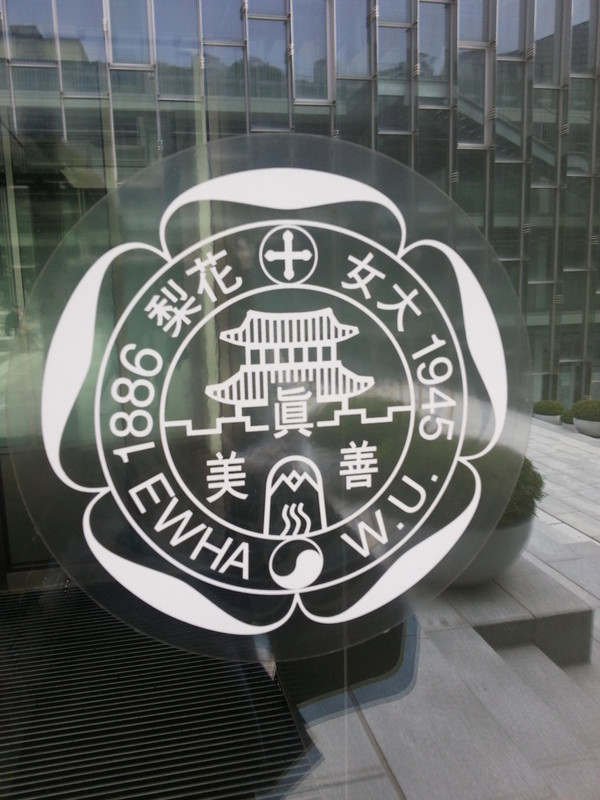吃完早饭,三个女生去了梨花女子大学。女子梨花大学在2号线上,站名就是梨花大学。学校大门一边是学校名字,一边是白色的浮雕的梨花墙,到处都是盛开的樱花。