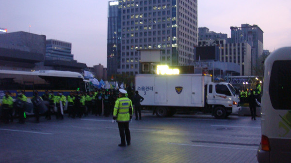 步行20分钟到了光化广场,却看到一车又一车的韩国警察,神色戒备,又听到广场上有人很激动的说韩语。随便抓了一个路人问是什么情况。无奈路人英文太差,用了google translate 才解释清楚。