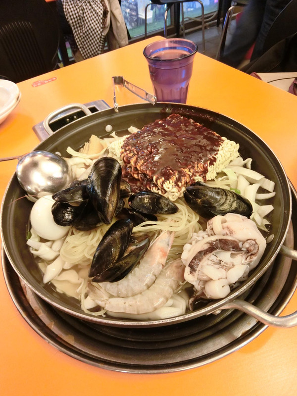 购物前,先去是部队锅,其实和我们的火锅没大差别,还是那种不太上档次的大杂烩火锅。据说部队锅的来源就是韩国和北chao xian打仗的时候,部队没东西吃,然后把什么都扔进水里搞了这么一锅。虽然这部队锅卖相一般般,味道倒还不错。