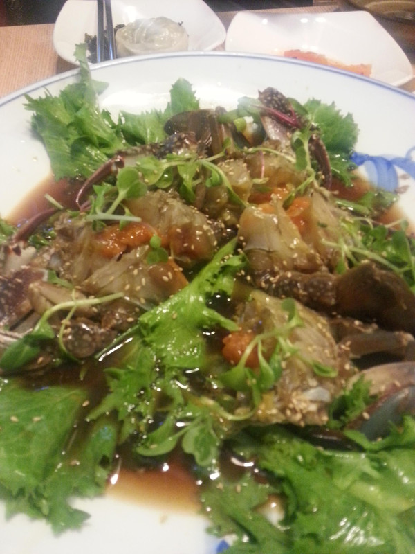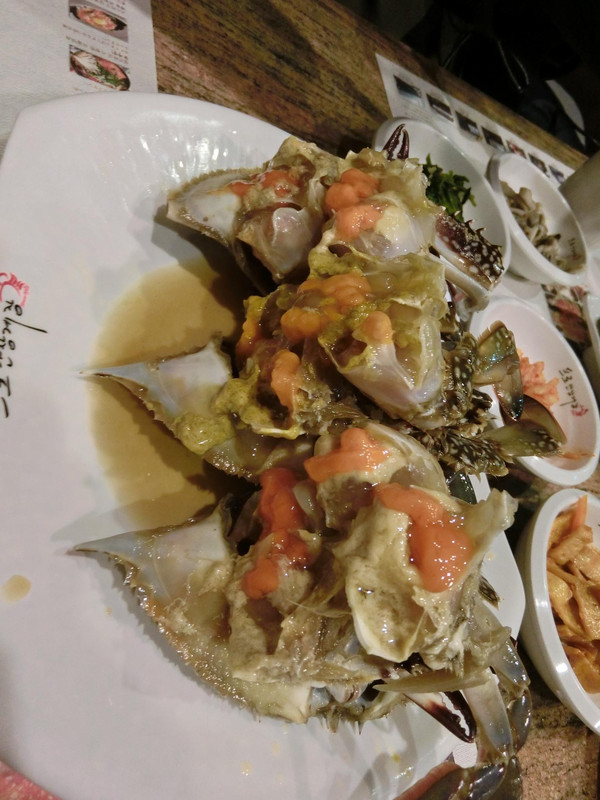 晚上去吃《来自星星的你》中千颂伊爱吃的酱螃蟹。其实我发现明洞酱蟹不就是宁波人的温蟹嘛? 韩国人不会又拿着我们的美食去联合国申请文化保护吧。