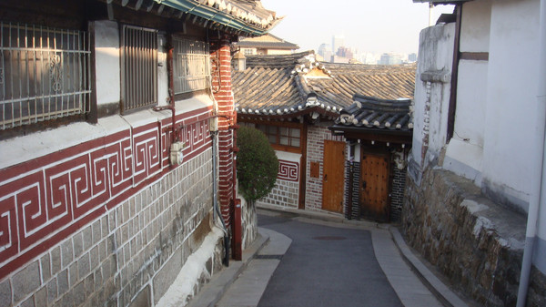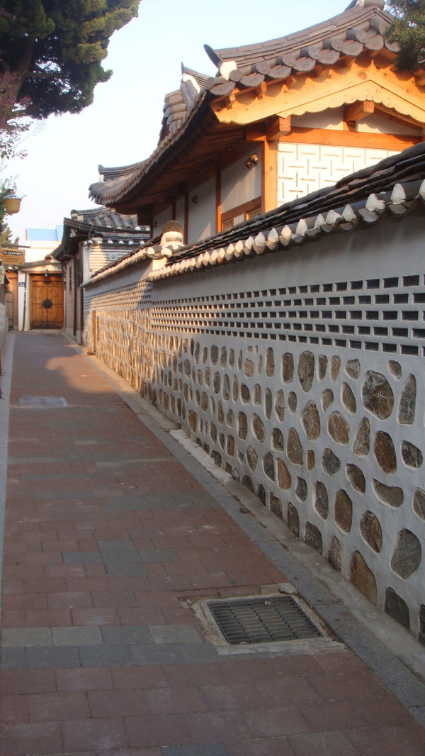 在三清洞走迷糊了,问了穿红衣服的志愿者,才搞清楚北村韩屋的入口。志愿者顺便给了一张北村地图,原来北村韩屋有八景,啊呀,我不要啊。不是逼我强迫症再犯,一定要把八景走完一遍嘛。 北村第8景是石阶路,据说是一整块石头造的。拾阶而上就到了北村韩屋的中心。这片韩国居民区,还保留着600多年前的风貌,村落依山而建,重叠起伏,细看每扇门都不同。这里是真正有居民居住的,可以看到孩子在门口玩球。北村韩屋到处都贴着请安静的提示,并且日落之后就希望游客离开。漫步期间,让感觉很像法国南部的小镇,那份被遗忘了的简单和宁静。这可能是唯一我想再来的地方。